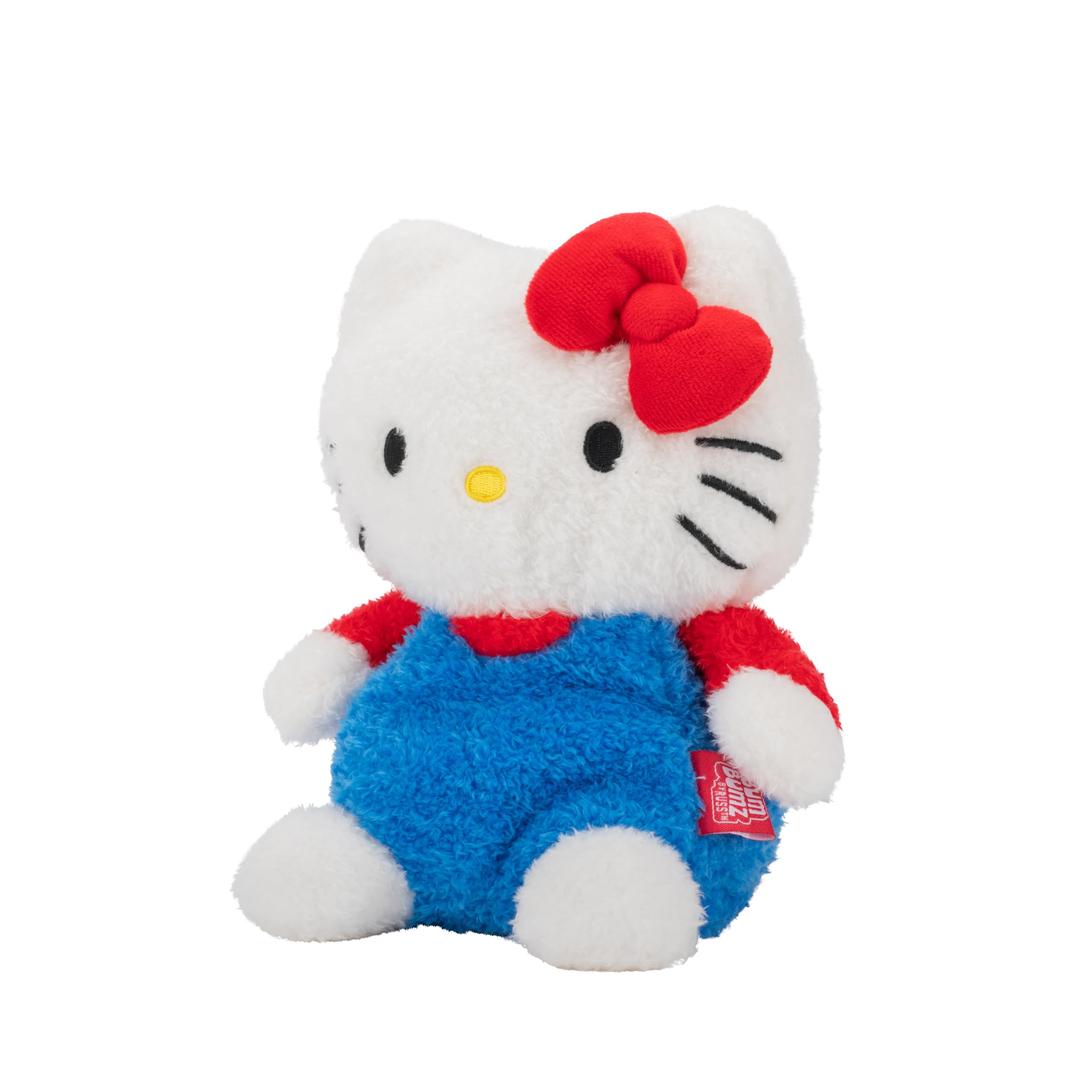 - CLASSIC HELLO KITTY Hello Kitty is dressed in her classic blue overalls with a red t-shirt and a matching red bow