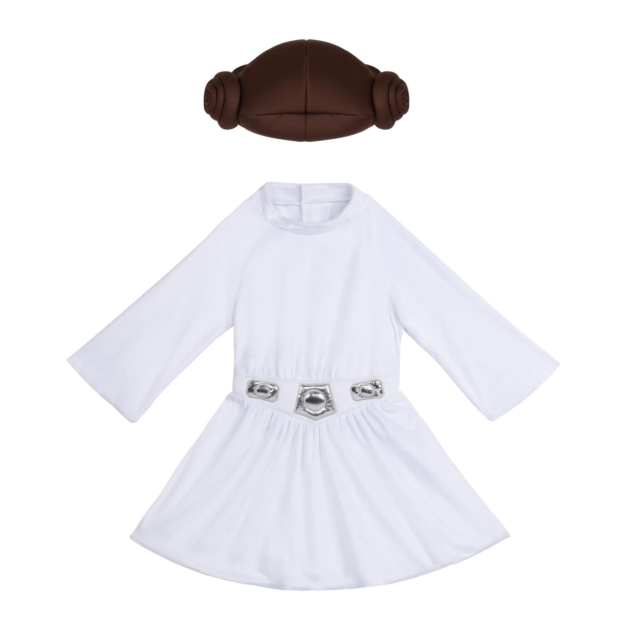 - HAIR BUNS: Suit features a foil belt waist plus a cap with Leia’s iconic twin hair buns